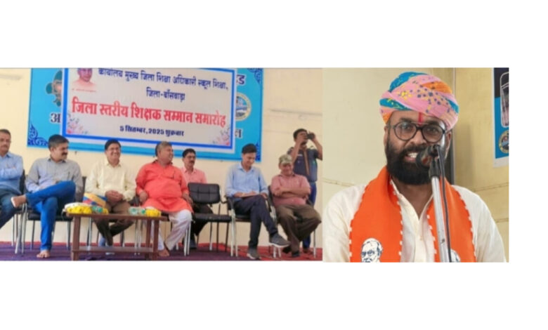 बांसवाड़ा। शुक्रवार को जिला स्तरीय शिक्षक सम्मान समारोह मुख्य जिला शिक्षा अधिकारी कार्यालय के तत्वाधान में भारत स्काउट गाइड डायलॉब बांसवाड़ा के सभा कक्ष में आयोजित किया गया। कार्यक्रम पूंजीलाल गायरी भाजपा जिला अध्यक्ष के मुख्य आतिथ्य, जयदीप पुरोहित मुख्य जिला शिक्षा अधिकारी की अध्यक्षता तथा समाजसेवी जन प्रतिनिधि हकरू भाई मईडा, विनोद राठौड़ एडीपीसी के विशिष्ट अतिथि, विमल चौबीसा एडिईयो माध्यमिक, हितेश स्वर्णकार एससीबीओ बांसवाड़ा ब्लॉक, धर्मेंद्र सिंह चरण ऐपीसी के आतिथ्य में आयोजित किया गया।