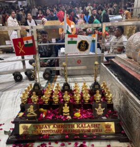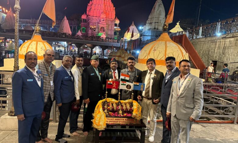उज्जैन, दिनांक 28दिसंबर 2025। 54वें विजय दिवस, 27वें कारगिल विजय दिवस तथा राष्ट्र की सर्वाधिक सफल सैन्य कार्रवाई ऑपरेशन सिंदूर की स्मृति में भारतीय सशस्त्र बलों के पूर्व सैनिकों का 10 सदस्यीय प्रतिनिधिमंडल, कर्नल पी. वी. हरि के नेतृत्व में पवित्र “विजय अमृत कलश” के साथ श्री महाकालेश्वर मंदिर, उज्जैन पहुँचा प्रतिनिधिमंडल द्वारा श्री महाकालेश्वर भगवान के दर्शन कर मंदिर परिसर में विजय अमृत कलश पर पुष्पांजलि अर्पित की गई एवं देश की रक्षा में अपने प्राण न्यौछावर करने वाले अमर शहीदों को श्रद्धांजलि दी गई। श्री महाकालेश्वर मंदिर प्रशासन द्वारा पूर्व सैनिकों के इस गरिमामय आगमन के दौरान आवश्यक व्यवस्थाएँ सुनिश्चित की गईं।महाकालेश्वर प्रबंध समिति की ओर से सहायक प्रशासक हिमांशु कारपेंटर एवं आई.टी. शाखा प्रभारी दीपक परमार द्वारा पूर्व सैनिक प्रतिनिधिमंडल का सम्मान एवं सत्कार किया गया।